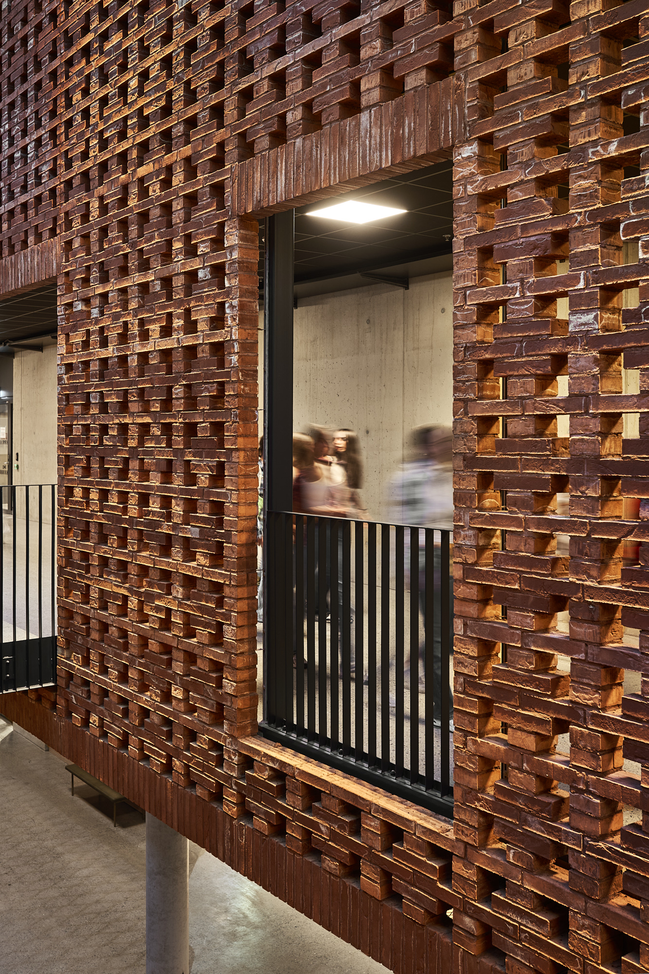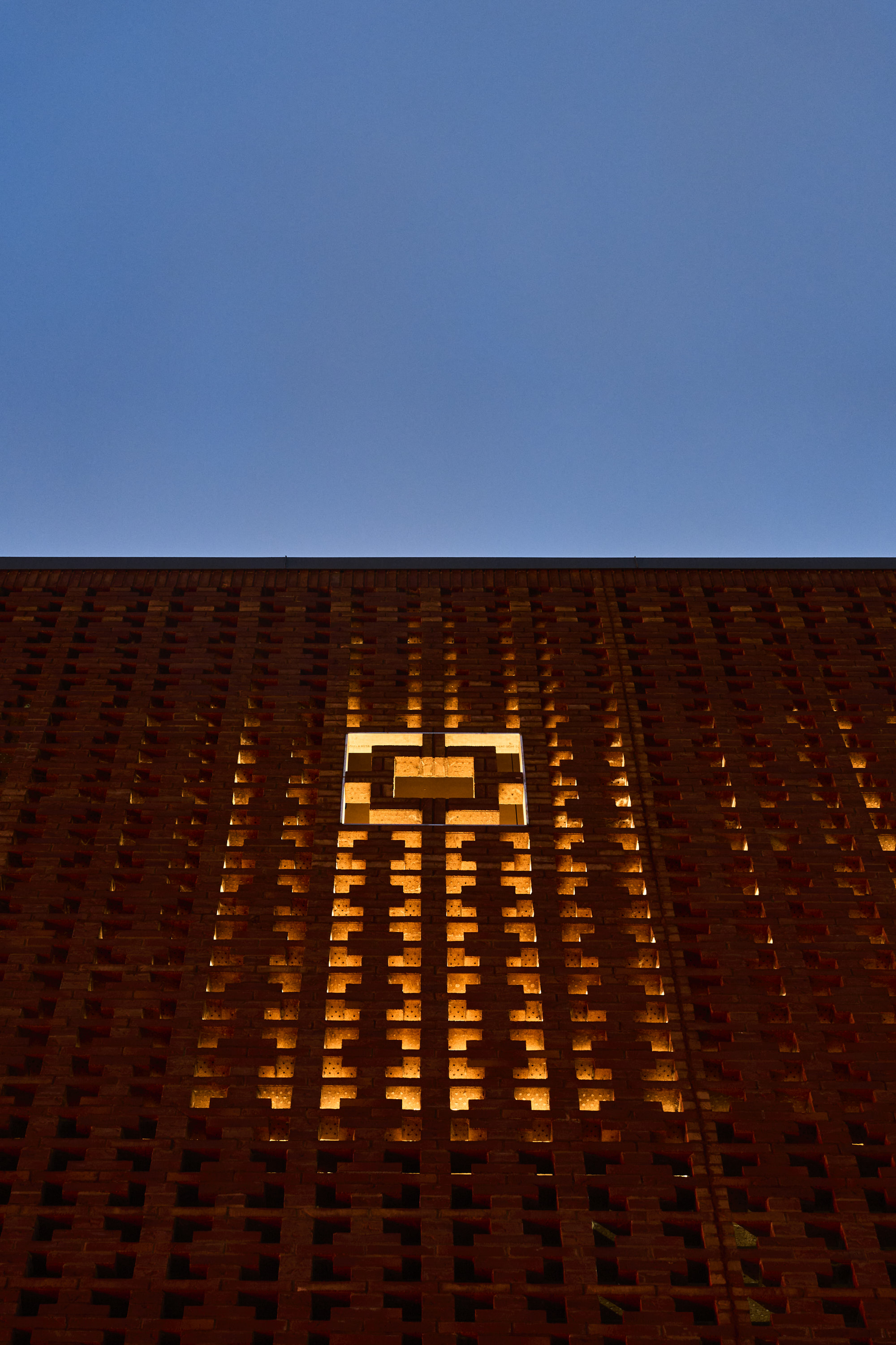 Skjermen støttes av stålsøyler bak den og er en kombinasjon av prefabrikkerte mursteinsbjelker og eksponert murverk. Den termiske omslutningen med glassseksjoner og vinduer er trukket tilbake bak skjermen, slik at lyset fra aktivitetene filtreres ut og brytes opp. Glassfasadene er dekorert med trykk av UKA kulturfestivalplakater.