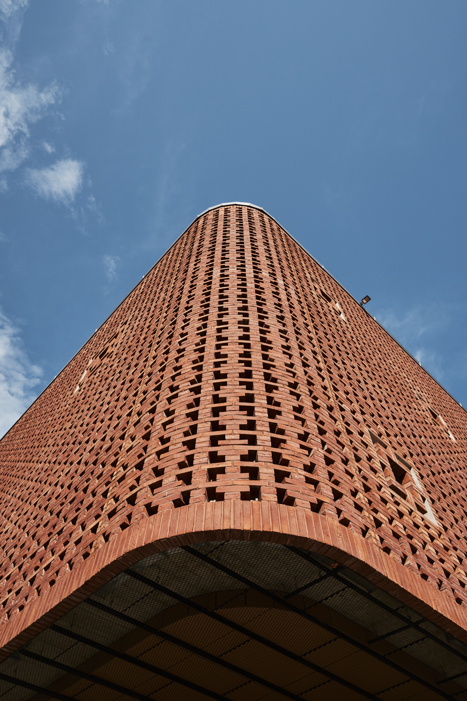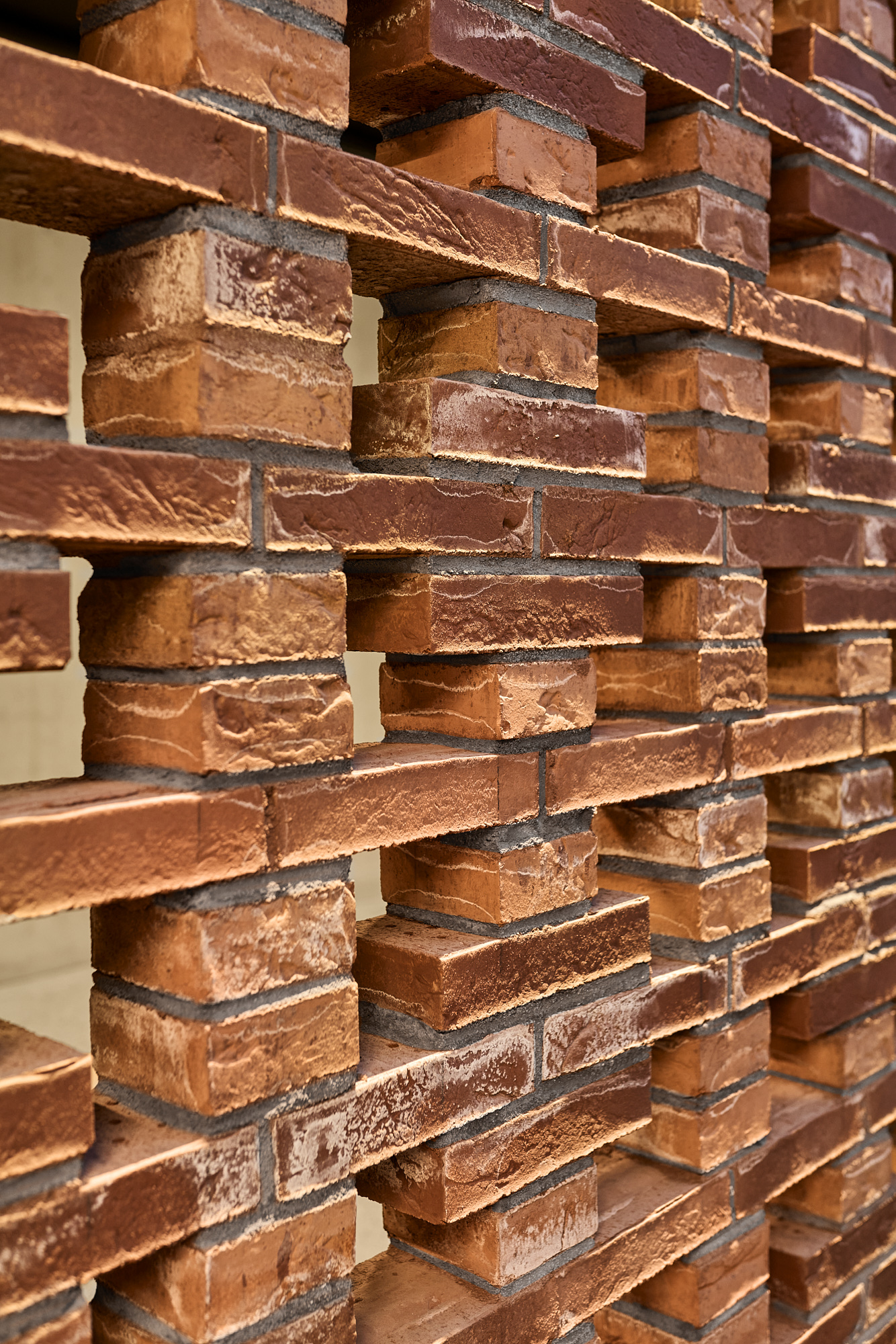 Den valgte mursteinen er en rød cellullarmurstein fra Wienerberger - Iltarusko Retro. Den ferdige murstrukturen ser elegant ut, men teknikken bak er langt fra enkel med en rekke sofistikerte løsninger for å realisere et svevende, transparent fasademønster.