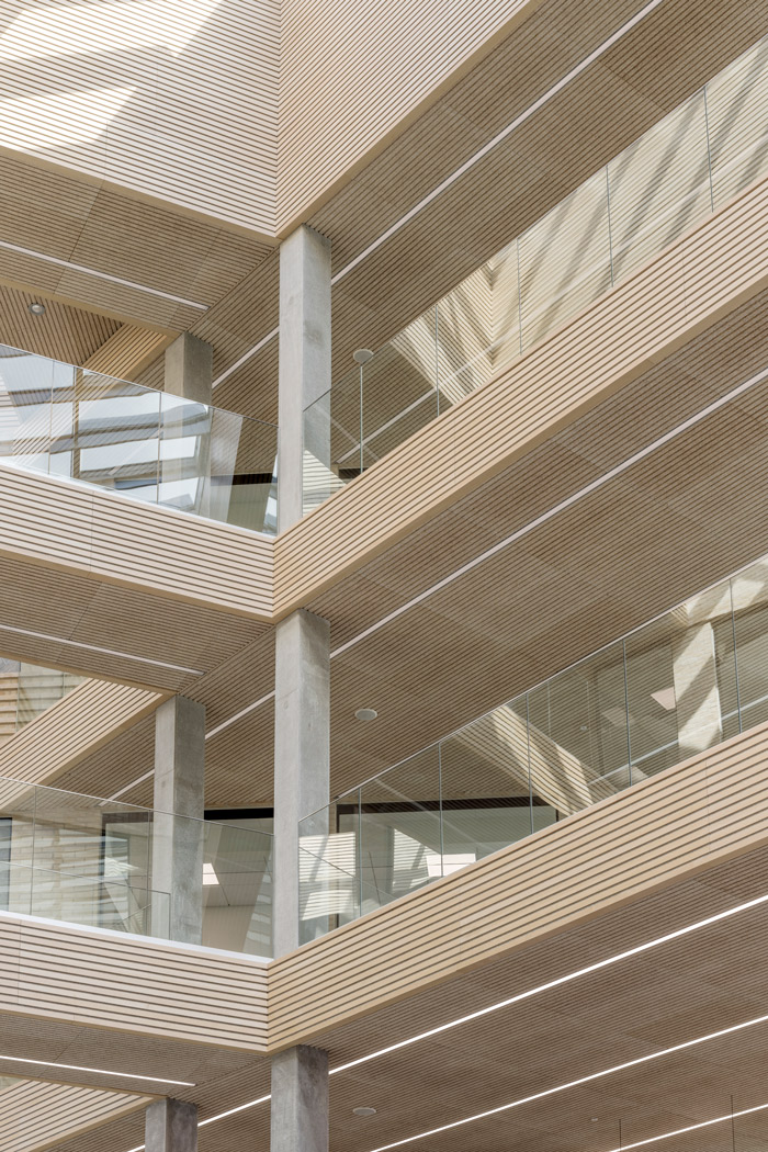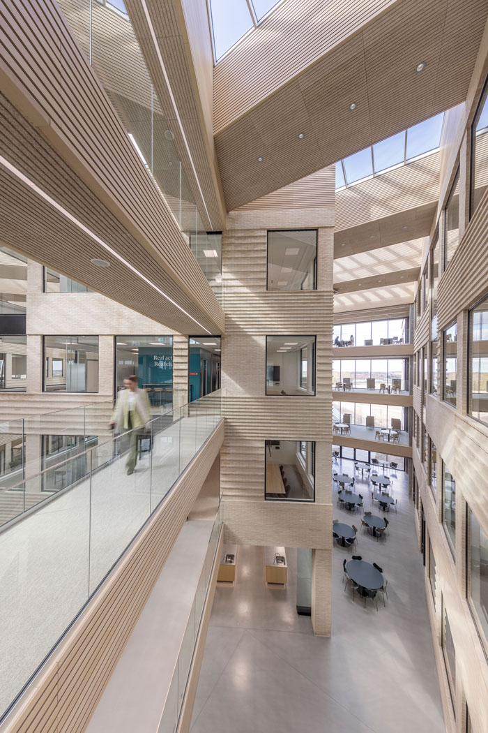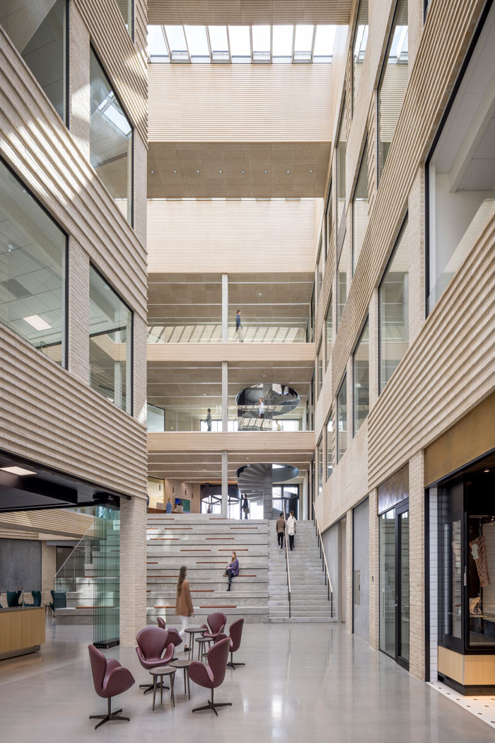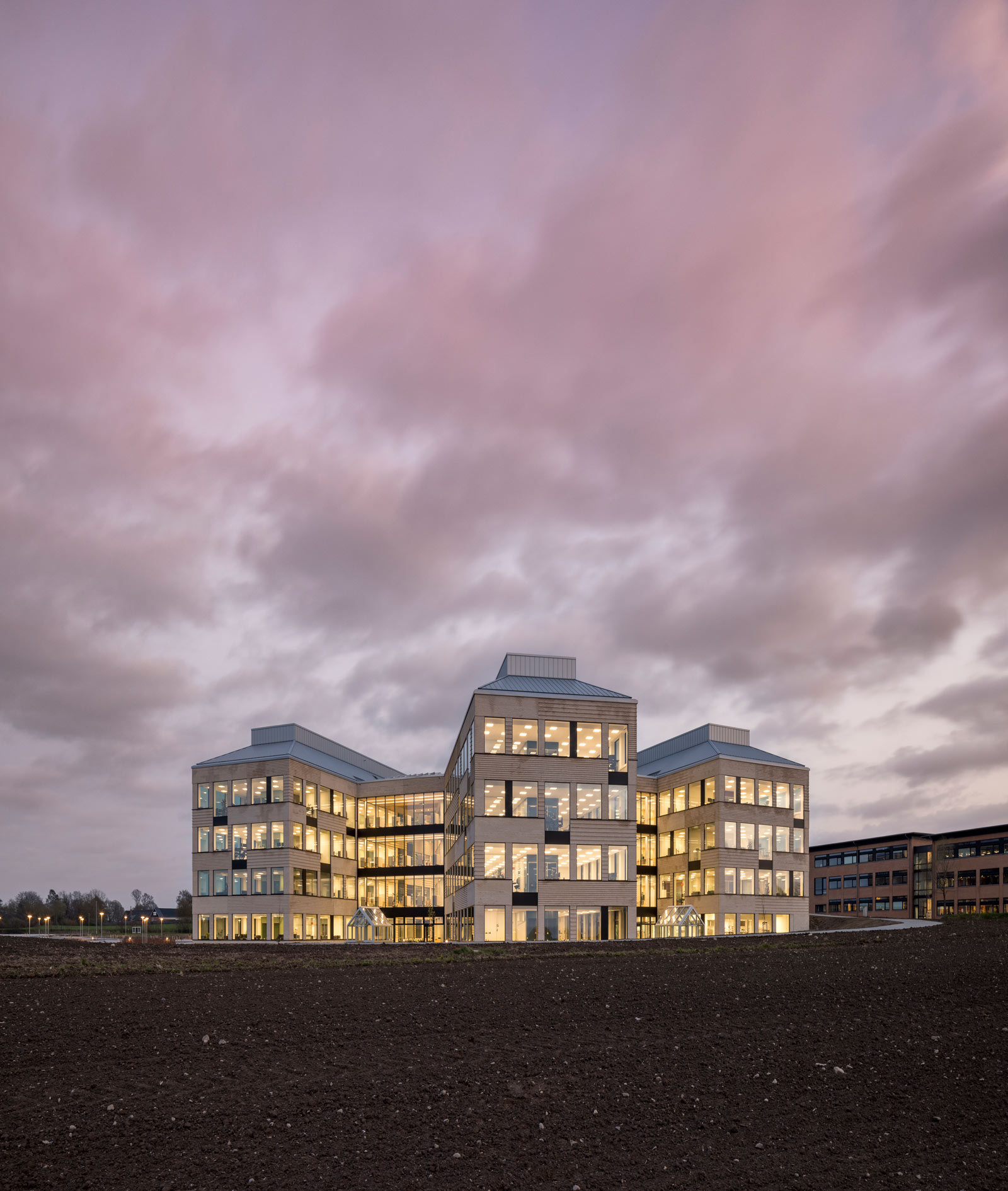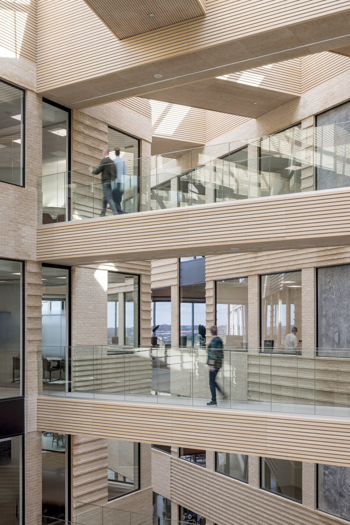 This award-winning design consists of three sculptural office buildings, that forms a cohesive architectural complex with the shared philosophy to maximize light. At ground level a communal entrance with reception and cafeteria welcomes users with a huge wide-open space, while crisscrossing transparent bridges connect each of the three office blocks.