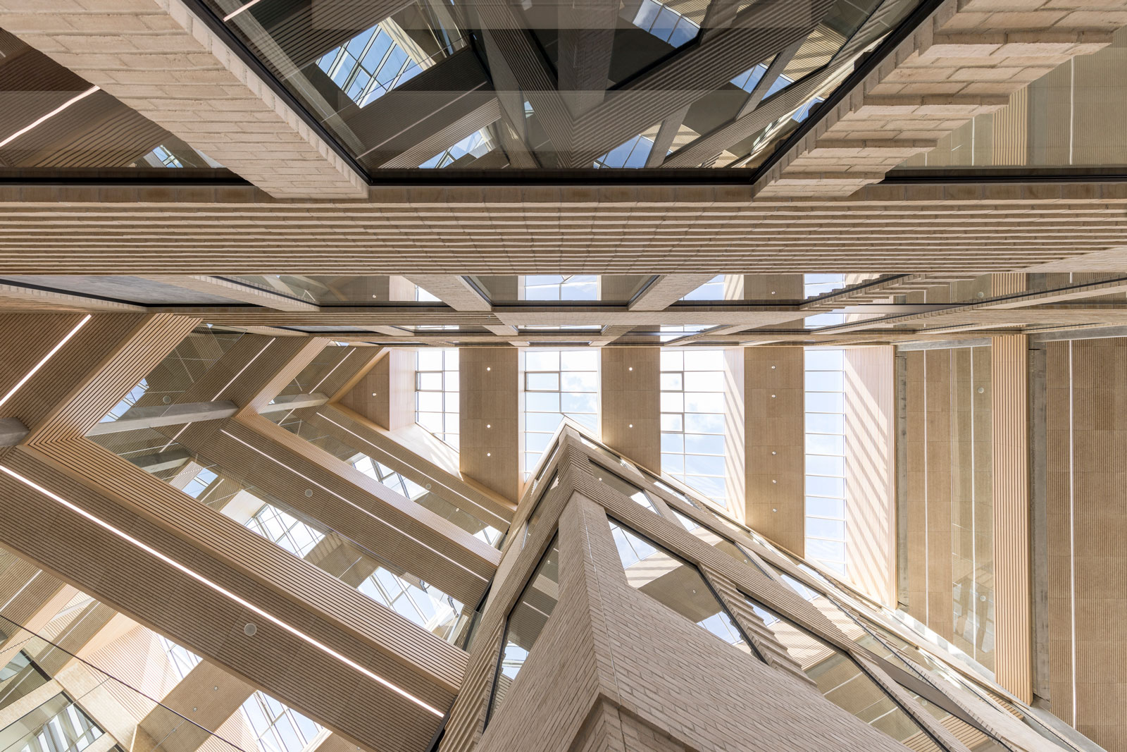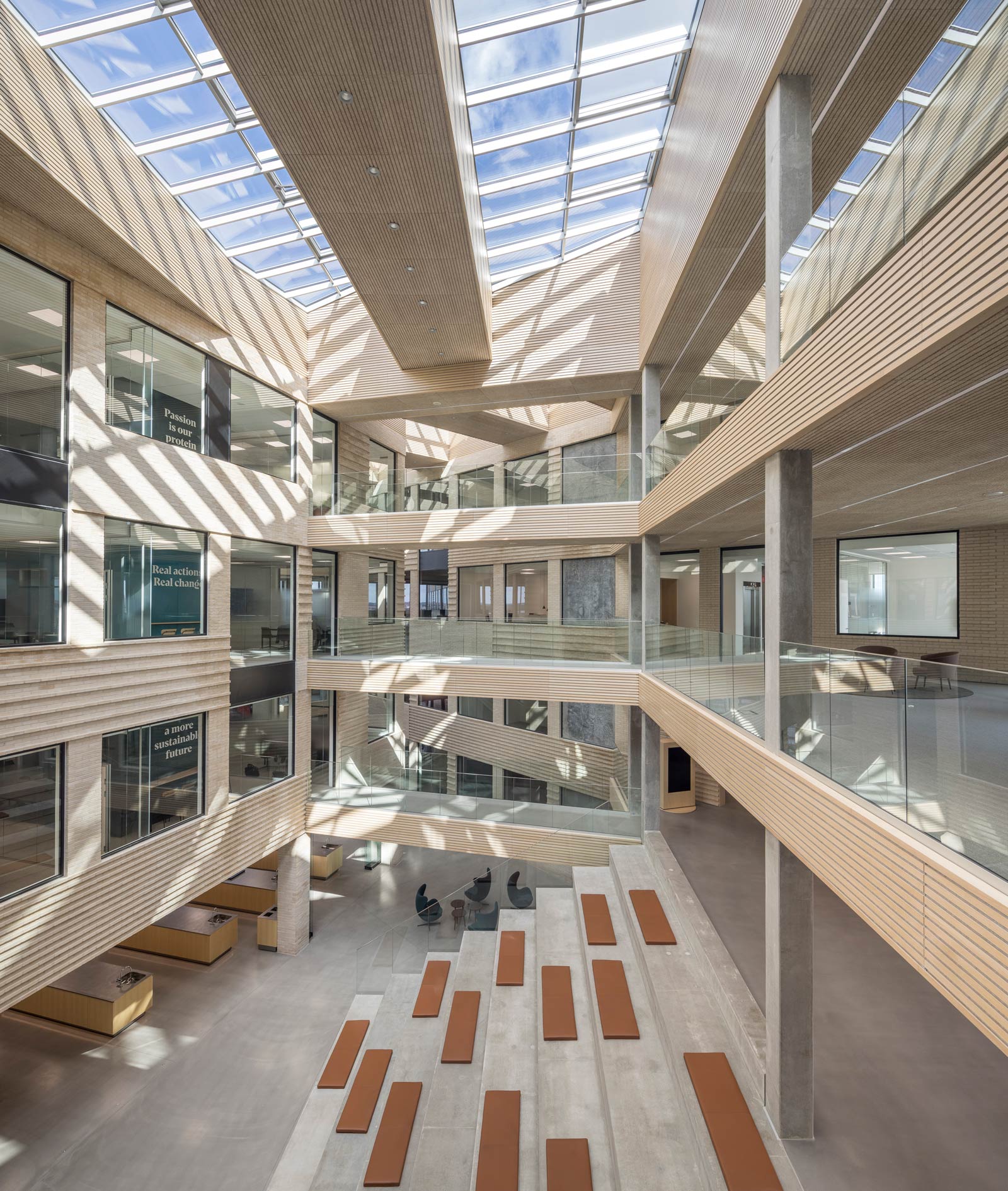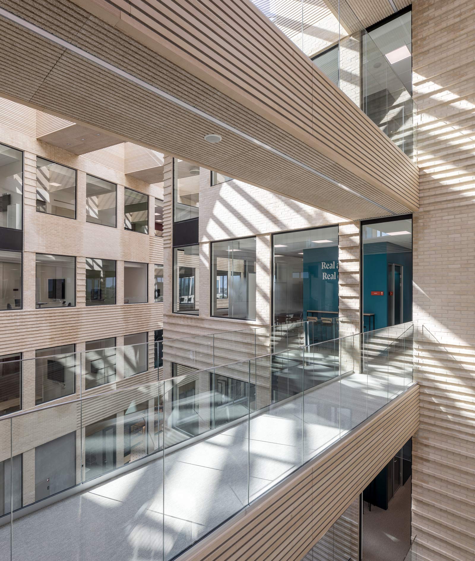 This award-winning design consists of three sculptural office buildings, that forms a cohesive architectural complex with the shared philosophy to maximize light. At ground level a communal entrance with reception and cafeteria welcomes users with a huge wide-open space, while crisscrossing transparent bridges connect each of the three office blocks.