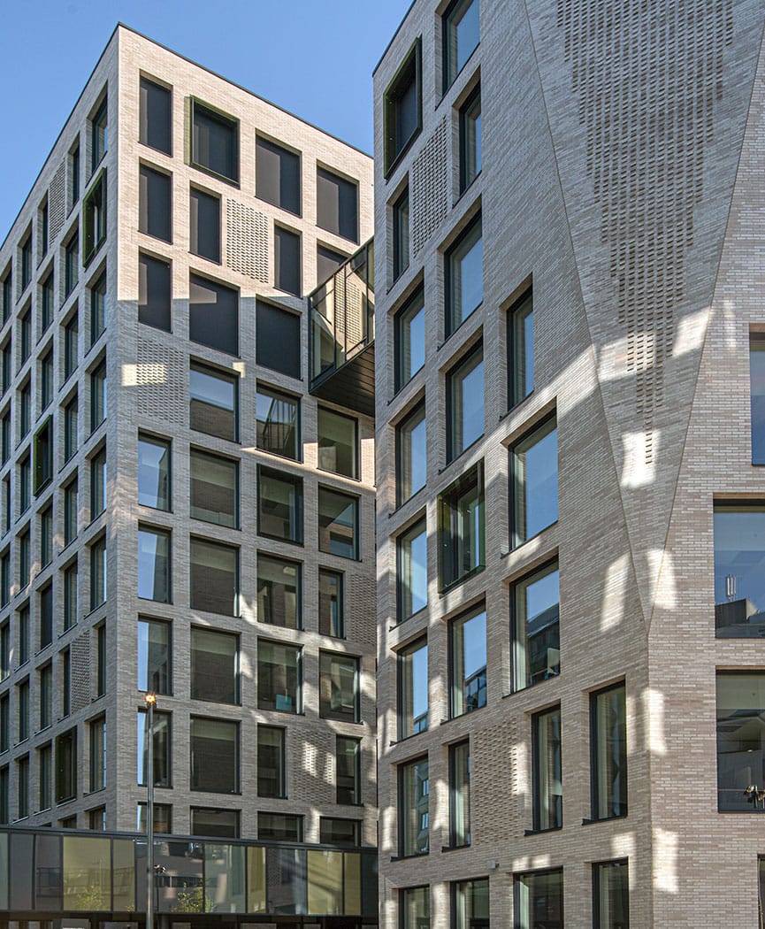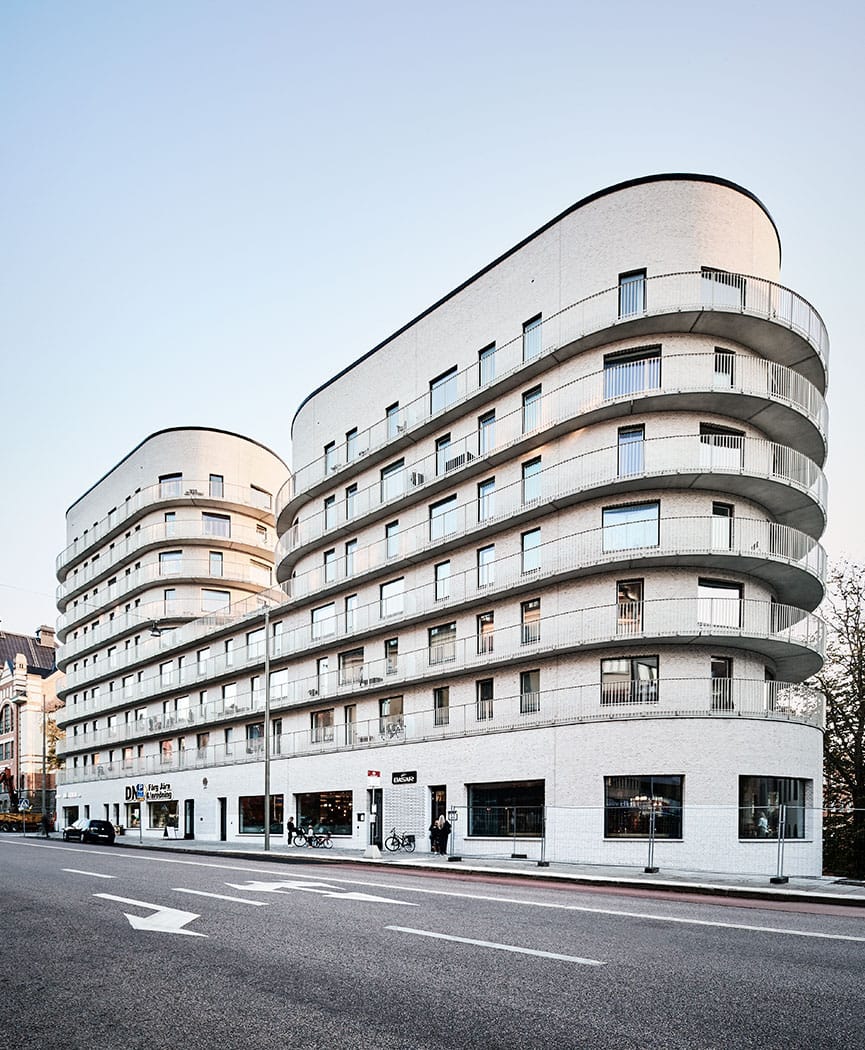Located in the heart of Stockholm. Basaren is a masterpiece of both architecture and engineering, where two oval forms resonate through the entire design and construction of these exclusive city apartments. This building is particular unique because of its façade of transparent masonry, which is made possible by the Carlsberg-system. The devil is in the detail, and this is no exception; each brick used for the transparent part of the brickwork has two extruded holes that matches the shape of the two towered-building. This requires extra structural support in wall elements, lintels and beams – but in turn provides a quiet synergy and gives the building a light and airy feel.