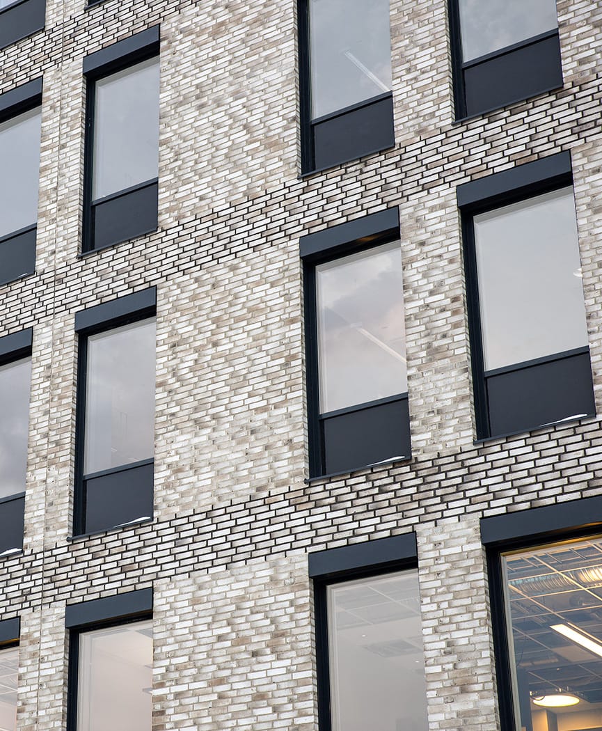 To reinforce the feeling that the house bodies are different individuals who stand for themselves and become personal, we chose different colours on the brick and different colours on the joints. After Randers Tegel delivered many test boards with different bricks and different colours on the joint, the choice finally fell on three joint colours and three types of bricks, RT475-Bari, RT575-Fusion, and RT571-Fusion. We also chose to work with different types of pattern masonry, such as copper in standing joints and cantilevers in the street level of the facades to create an exciting expression in the facades. The colour choice for the windows was also important. Because some windows got a dark colour and others a white colour on the window frames, the personality of the house bodies is further strengthened. To avoid getting a feeling that the houses were moving away from the street, we let the stairs from the apartments to the north go down to the sidewalk. Thanks to this, we connected the street with the houses and achieved a Brooklyn feeling… albeit in Eskilstuna vintage.