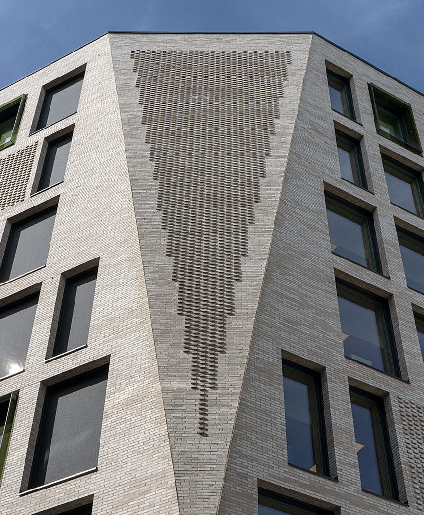 Block of apartment building in three different brick colours with each its distinctive expression. Matching colours and exciting masonry in the façade make these city apartments blend in an architectural sense, despite the different colours.